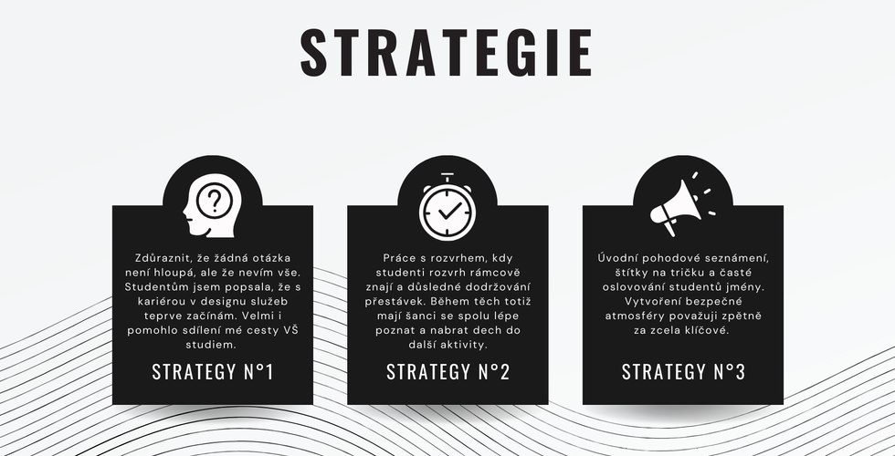 Co se rozhodně vyplatilo: neformální představení s cedulkami na tričku, vytvoření bezpečí pro jakoukoli otázku a na konec to byla práce s přestávkami. Jednak studenti a studentky nabrali dech a co je mnohem podstatnější vytvářili si přátelství přesahující náš WS.